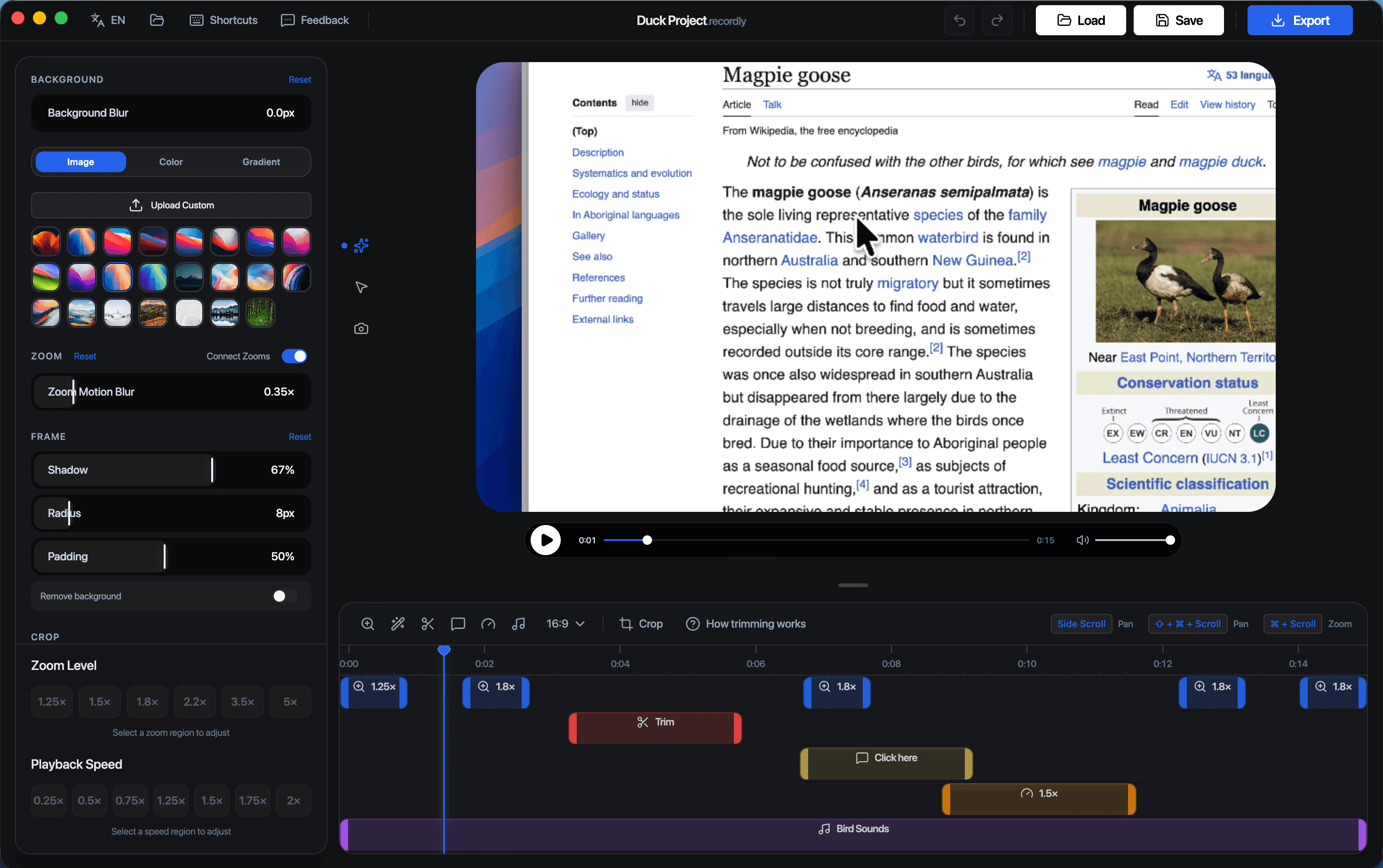 Use drag-and-drop pieces to control video speed, zooms, annotations, audio tracks and video length, and save your projects as .recordly files so you can save your progress or edit other projects.